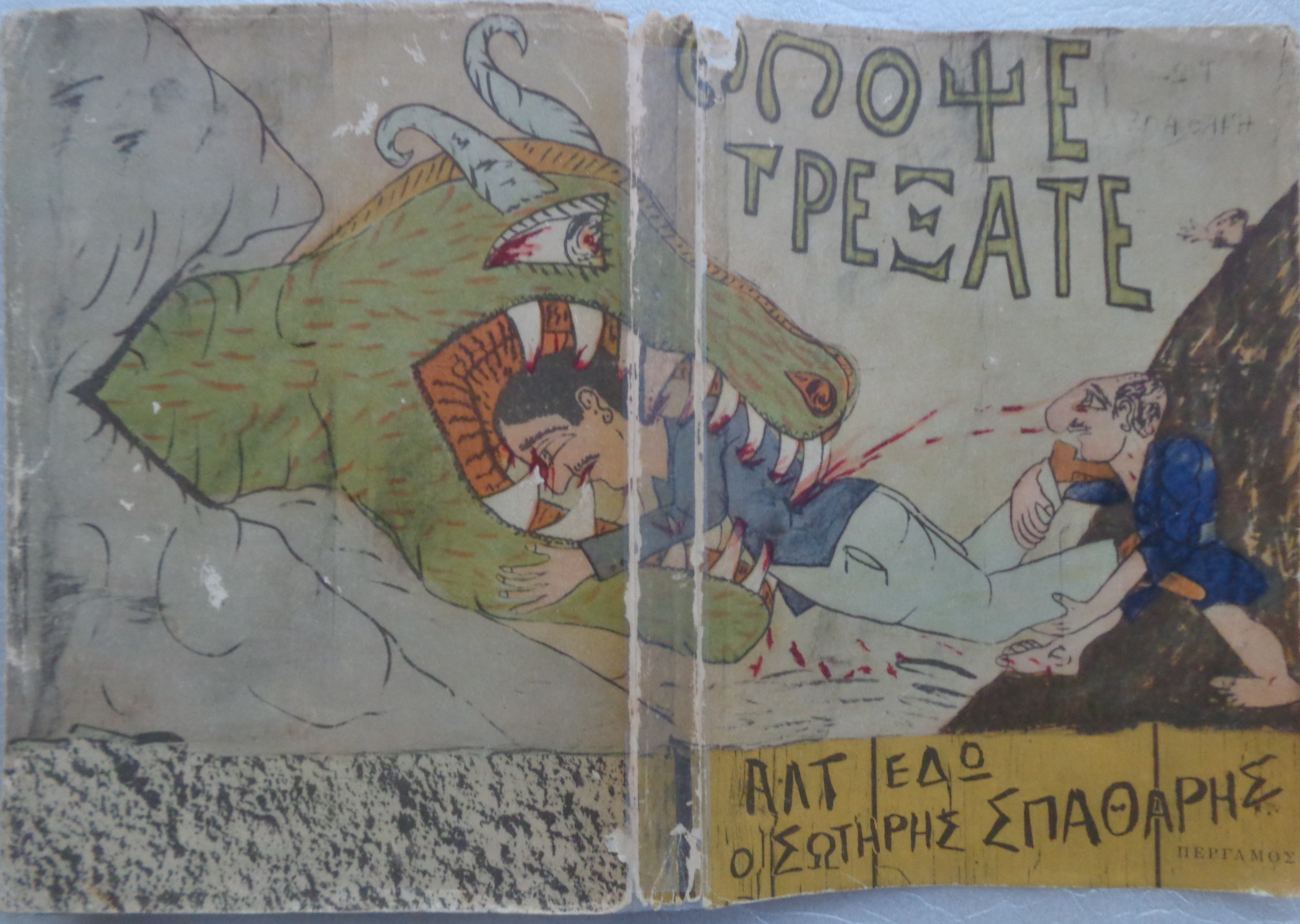 Αρχικά εξώφυλλα. έχει διατηρηθεί – με φθορά επιδιορθωμένη με ειδική συντηρητική ταινία- το αρχικό εικονογραφημένο περίβλημα (του Γ. Τσαρούχη).
