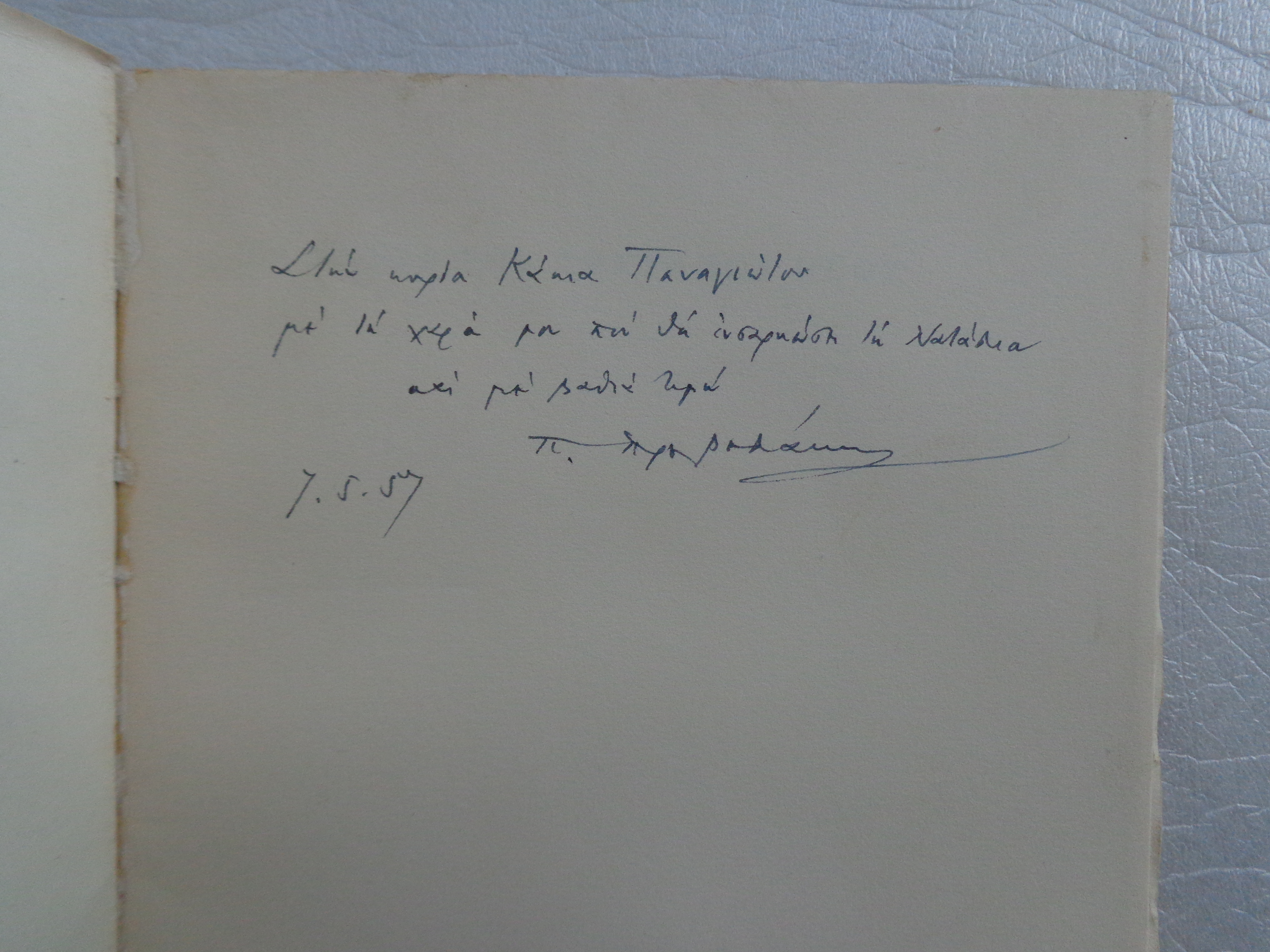 Αντίτυπο με αφιέρωση του συγγραφέα στην ηθοποιό Κάκια Παναγιώτου.